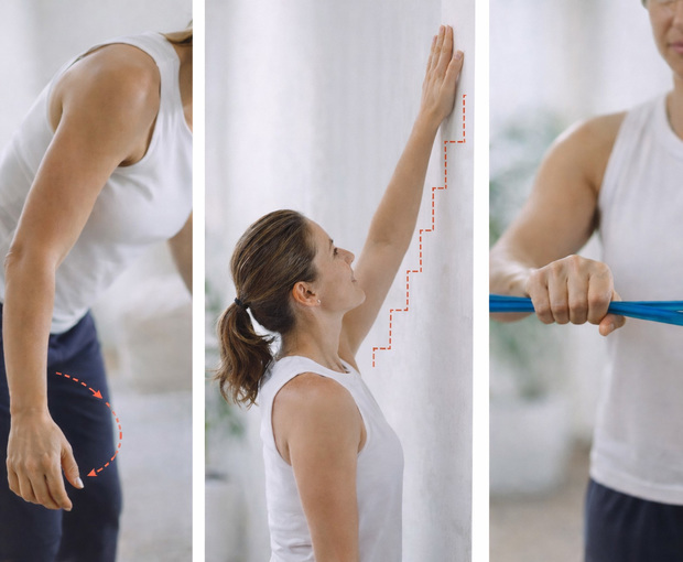 | Exercice pendulaire (Codman) | Élévation guidée au mur | Rotations avec élastique |